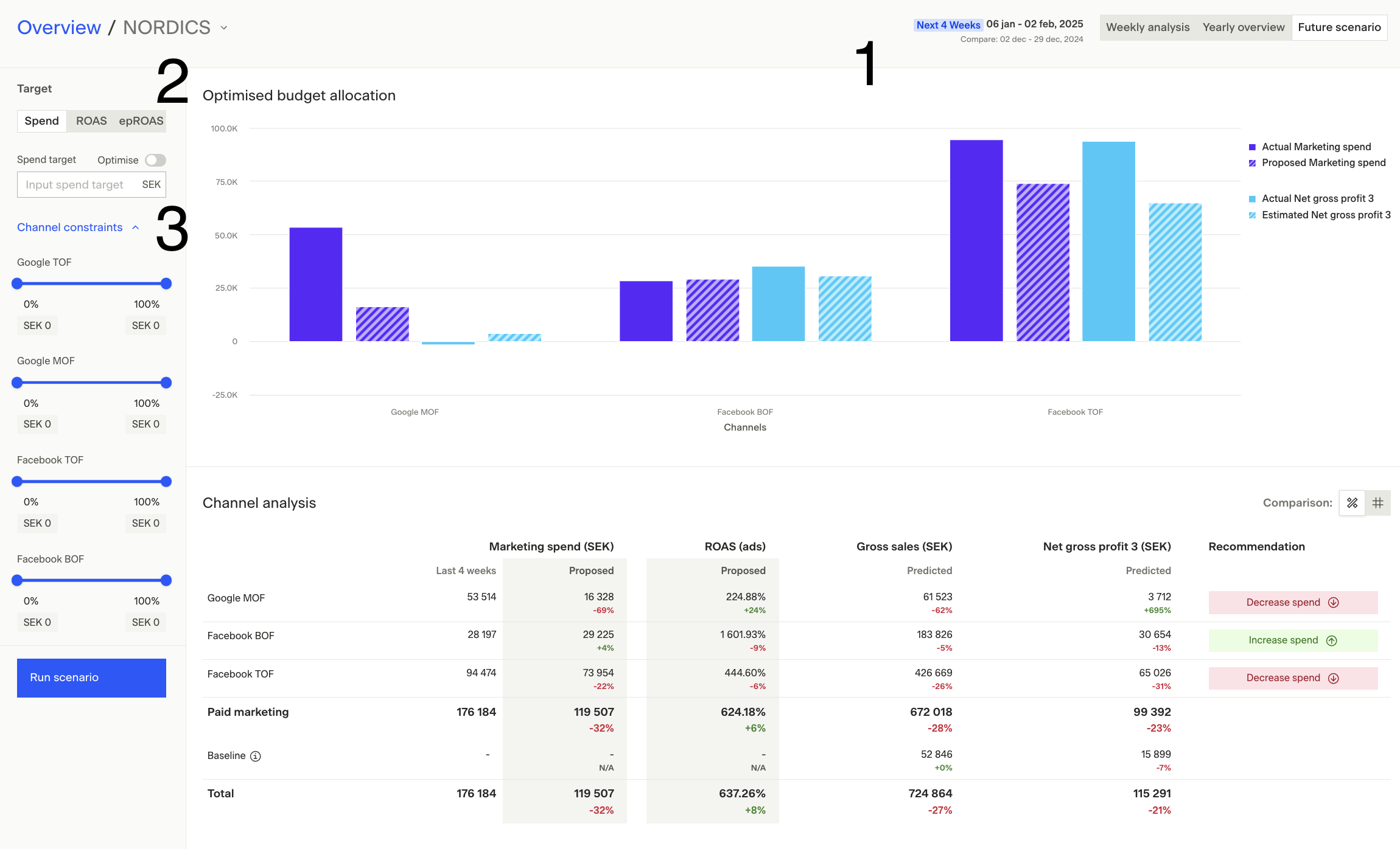 - Re-run scenarios: Try adjusting constraints (e.g., a higher total budget or different min/max spends) to see if you can sustain or increase Net gross profit 3 while spending more overall.
