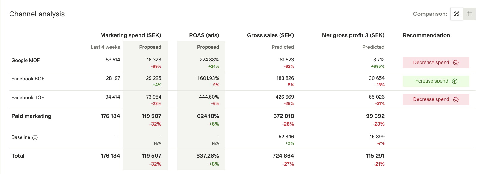 - Even if sales or absolute profit is lower than before, the new spend distribution may offer better returns per SEK spent, matching your chosen overall budget or ROAS/epROAS constraints.