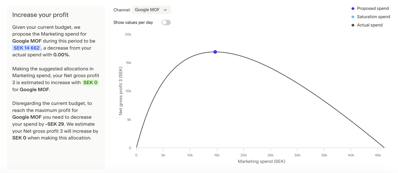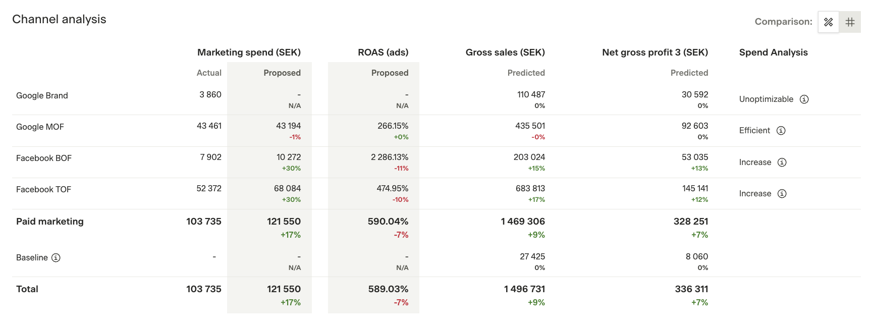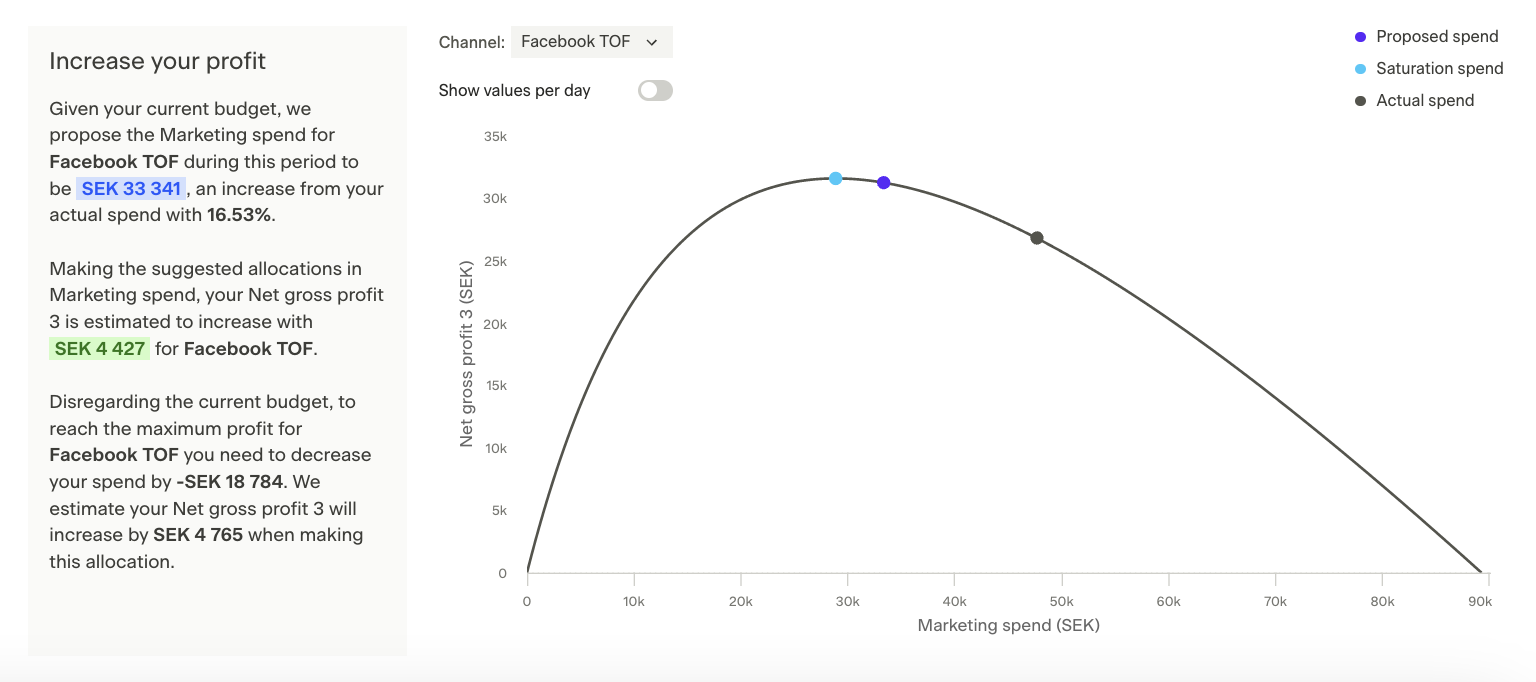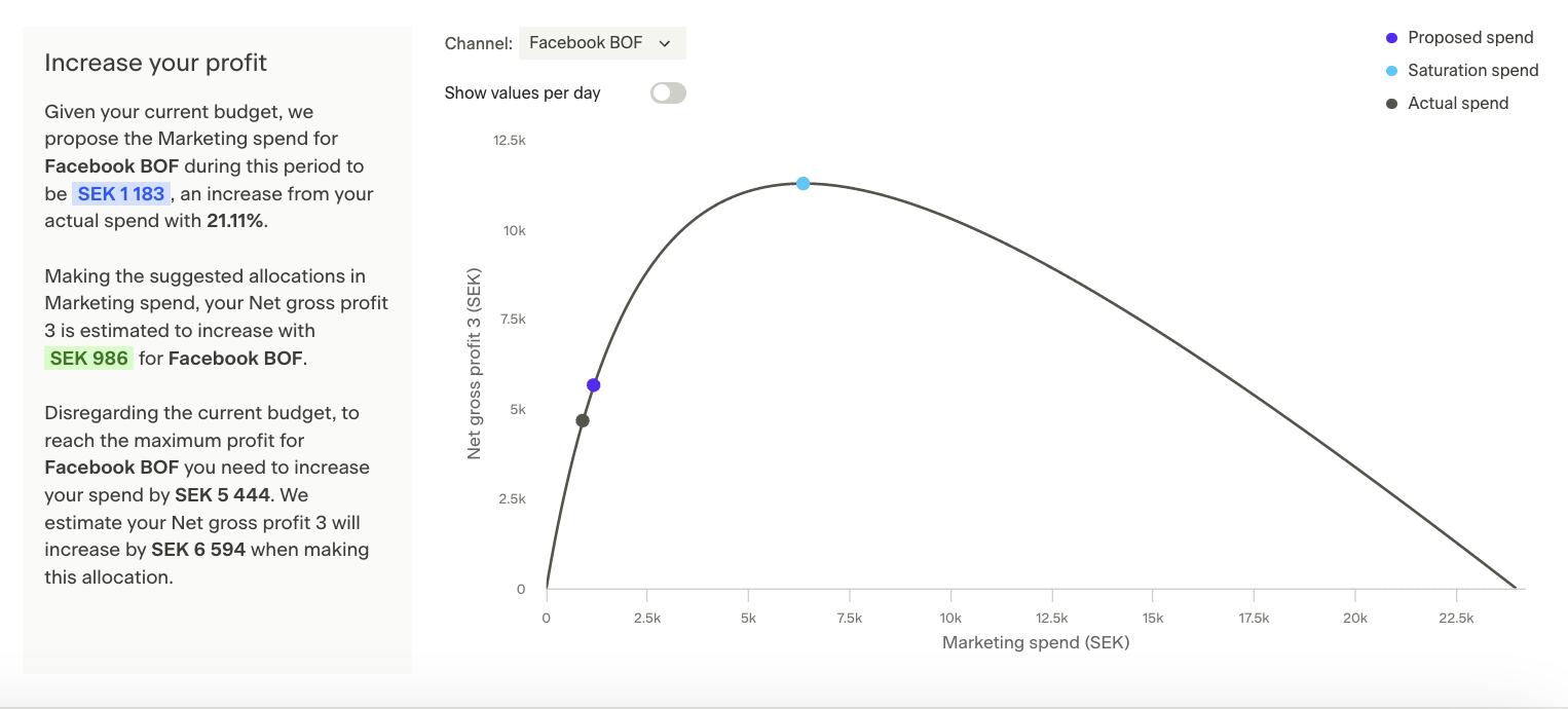 - By boosting spend ~21%, the model predicted an additional 986 SEK in net gross profit 3.